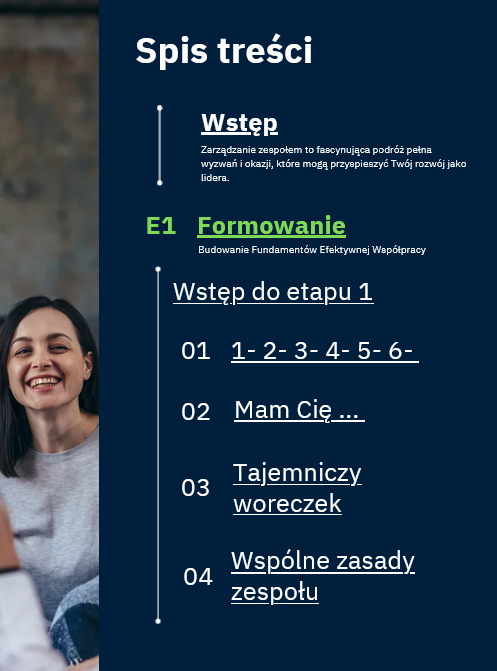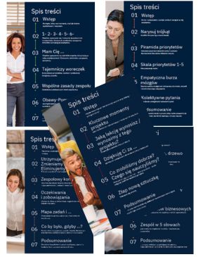 Możesz kupić wybraną część e-booka (Formowanie, Docieranie Normowanie itd.), pakiet 5 e-booków (ale każdy w oddzielnym pliku pdf) lub cały e-book (w jednym pliku pdf). Każda z części zawiera zestaw ćwiczeń, przykłady i wskazówki, jak efektywnie pracować z zespołem.