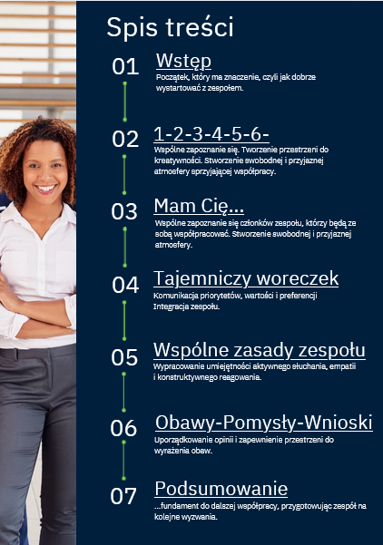 Komplet 25 praktycznych ćwiczeń, uporządkowanych według modelu Tuckmana.